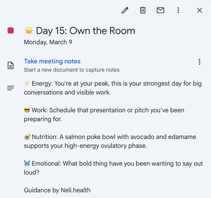Your cycle intelligence directly in your work calendar — not another app to check or another place to track your cycle.