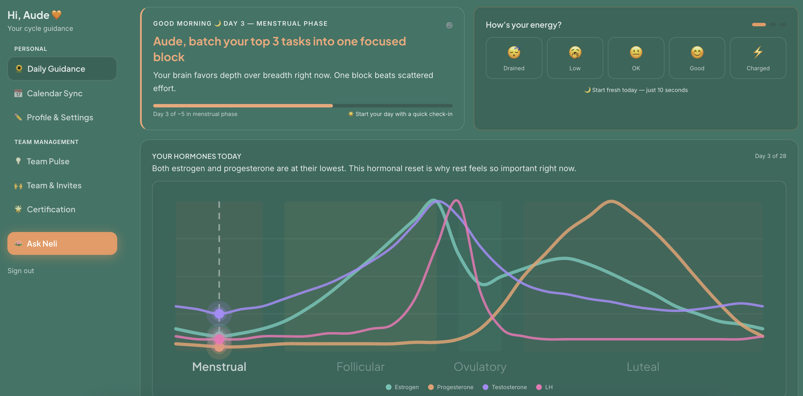 Ask what to eat today, generate a phase-matched workout, or understand why you feel a certain way. Neli adapts to your phase, energy, and preferences — so every answer is personal.