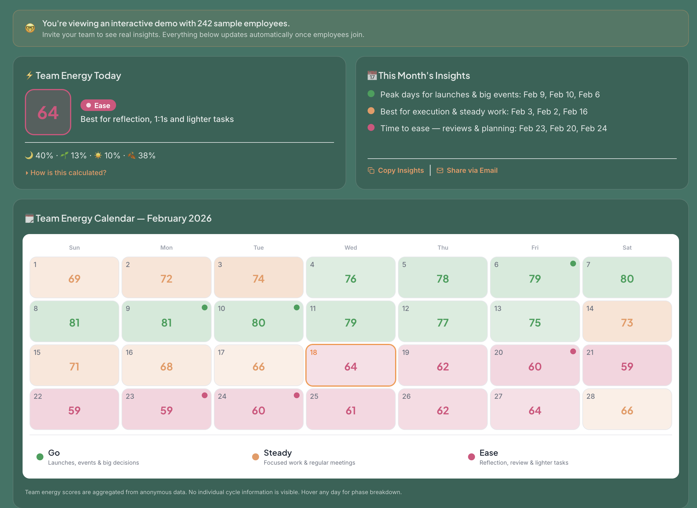 Team leaders see energy patterns — not personal data. A color-coded calendar shows which days are best for launches, which are ideal for focused execution, and which to keep lighter for reviews and planning.